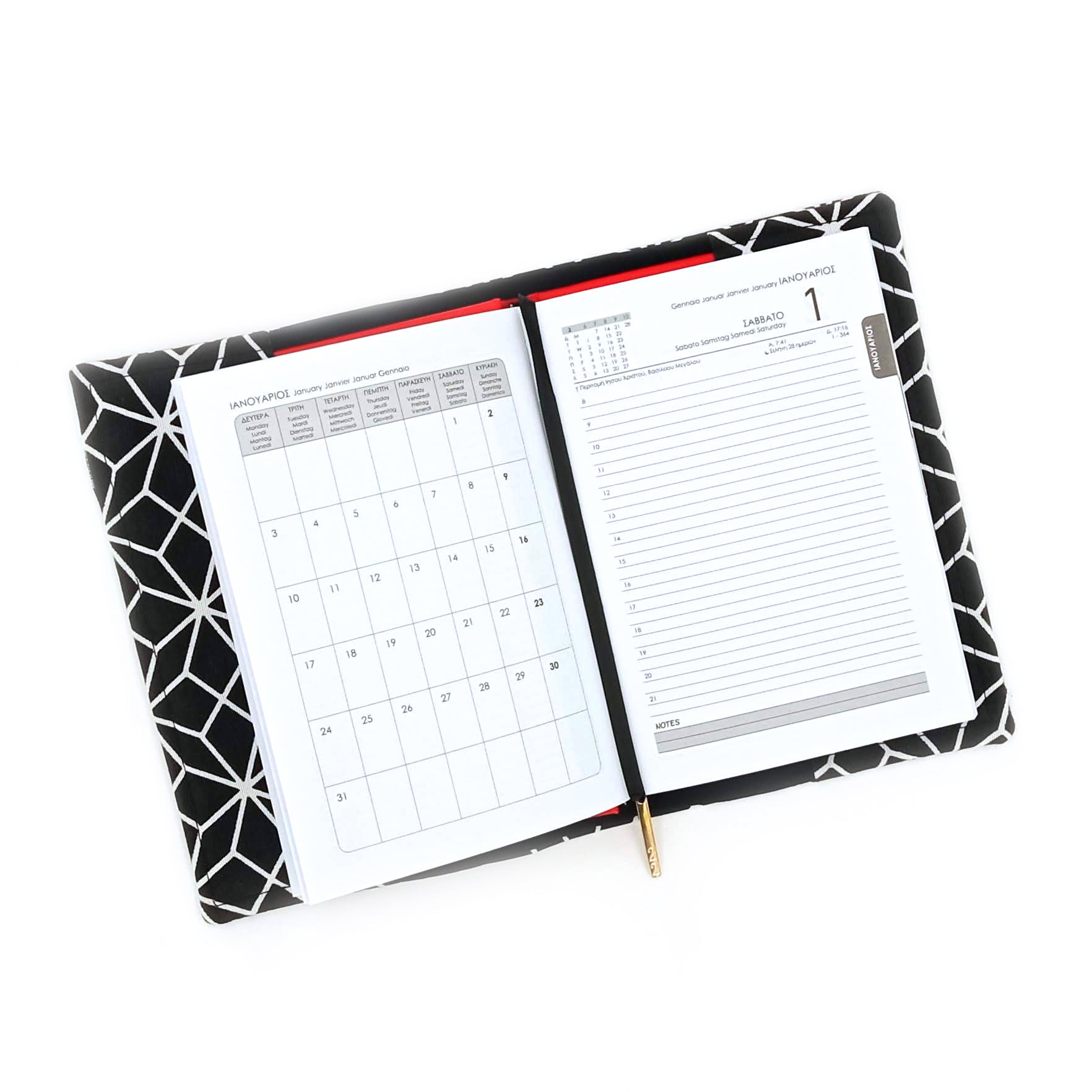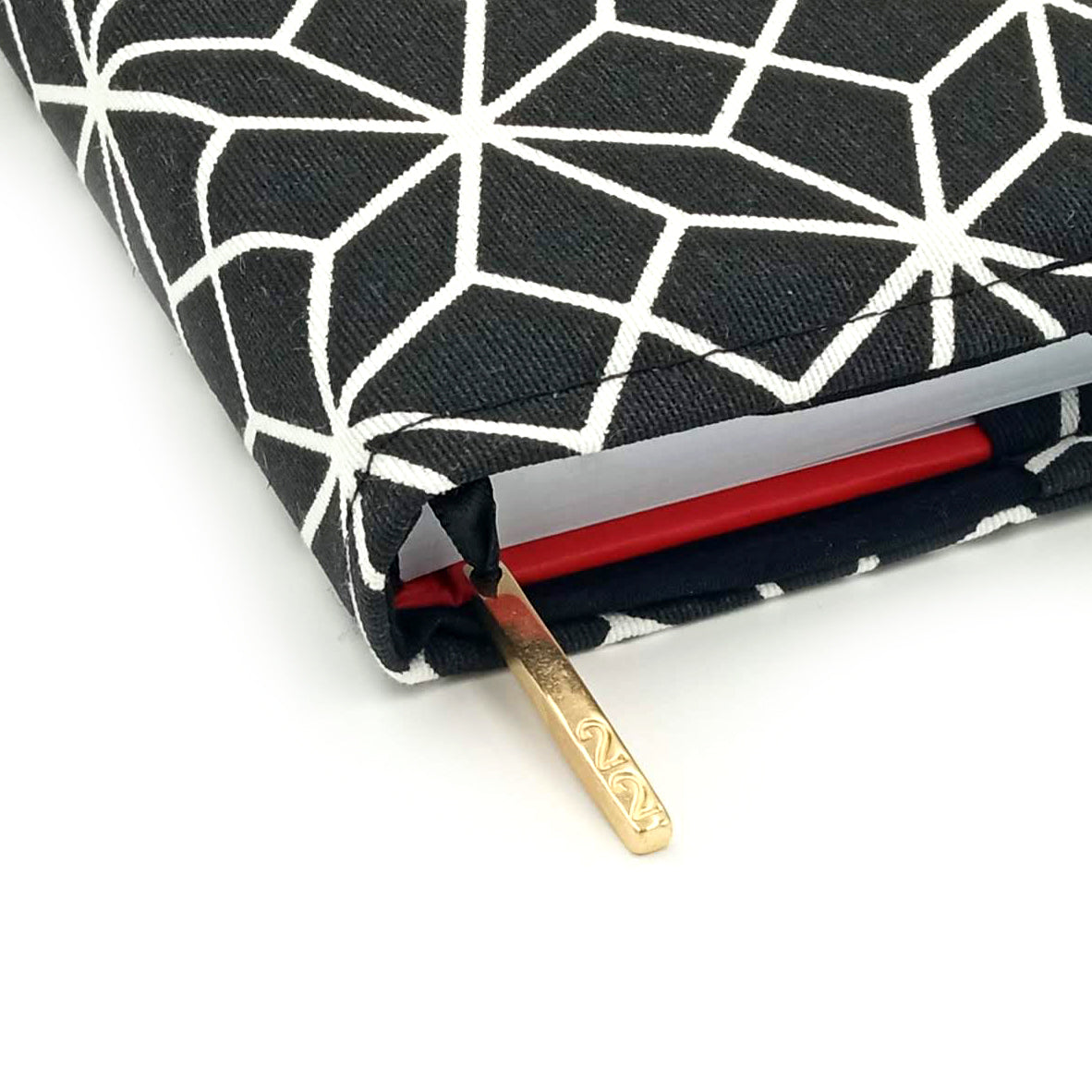 Συνδυάζει ύφασμα με γεωμετρικό σχέδιο εξωτερικά με μονόχρωμο εσωτερικά και έχει ενσωματωμένο σελιδοδείκτη με μεταλλική λεπτομέρεια '22'