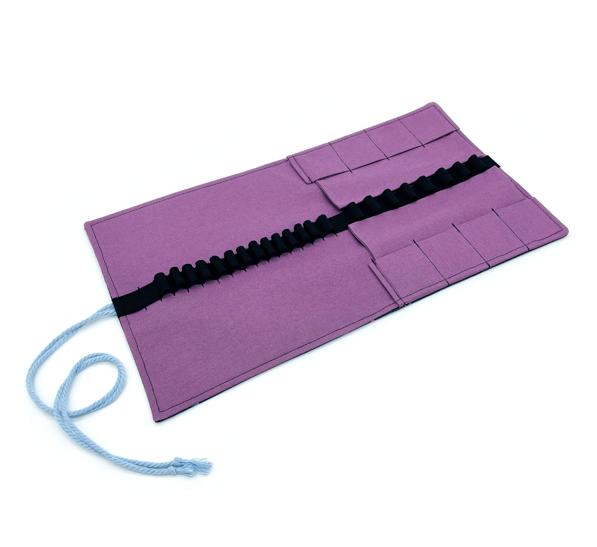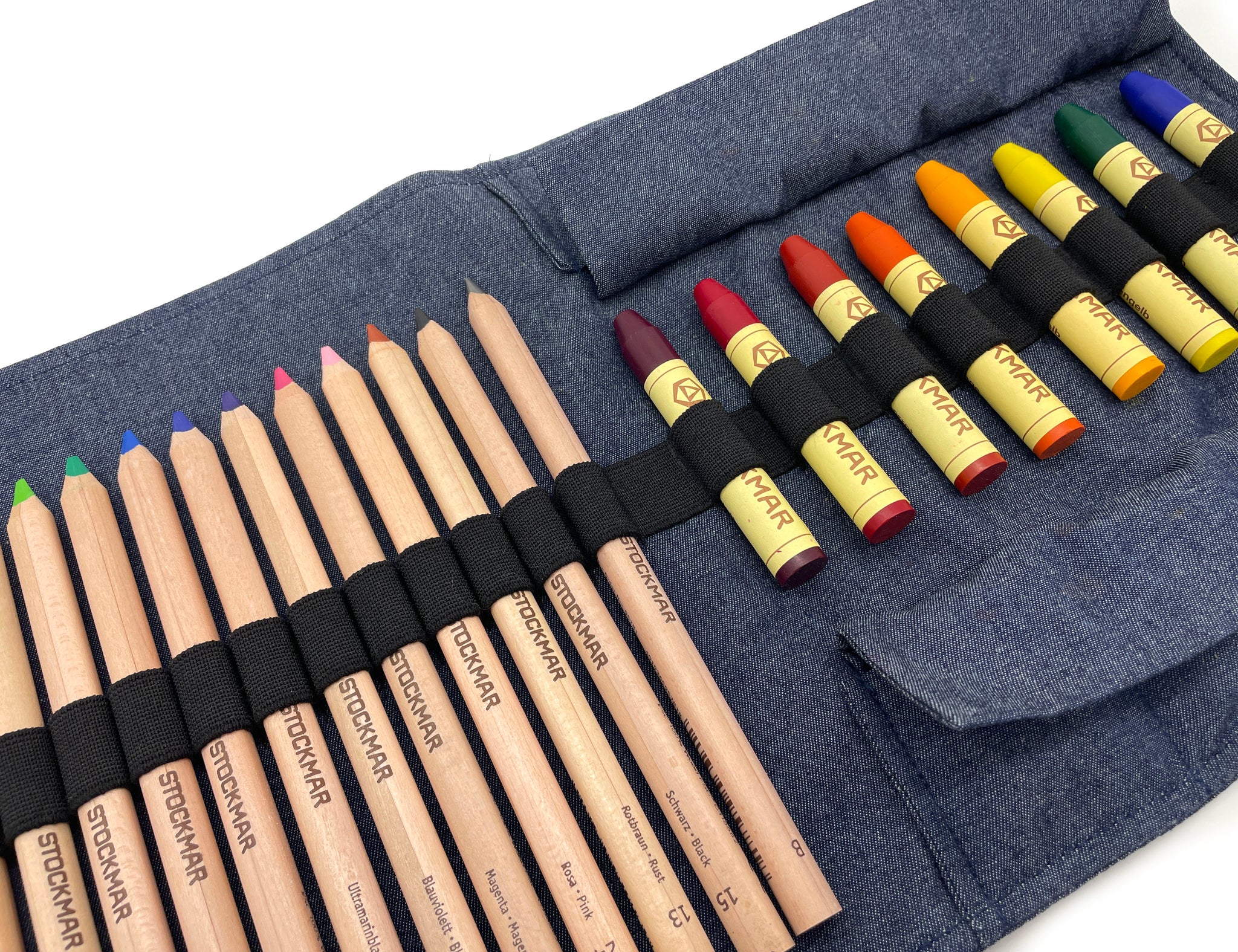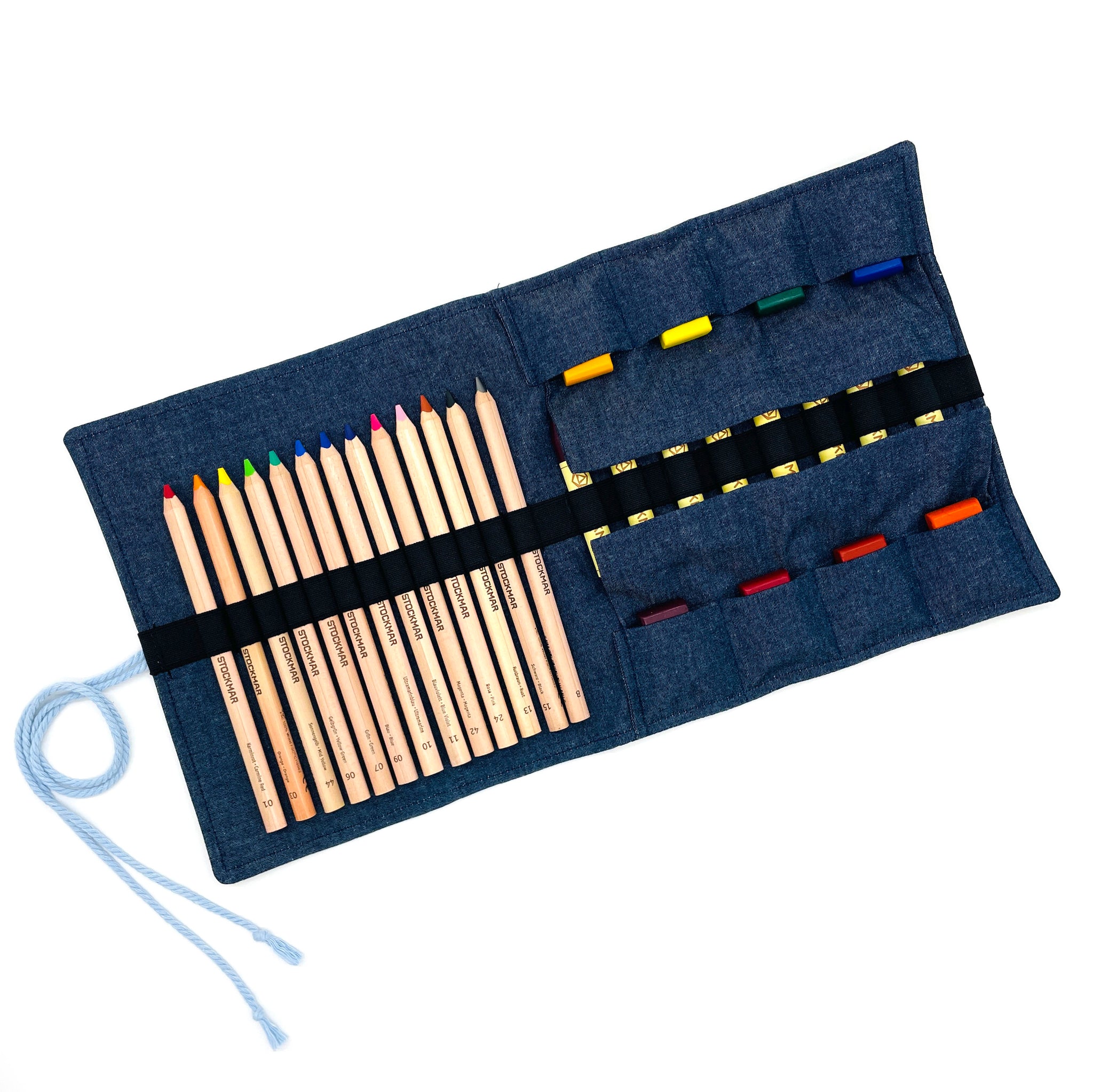 Διαθέτει θέσεις με λάστιχο για δεκατέσσερις ξυλομπογιές και οκτώ κηρομπογιές, καθώς επίσης οκτώ τσεπάκια με καπάκι για κηρομπογιές σε μορφή block.