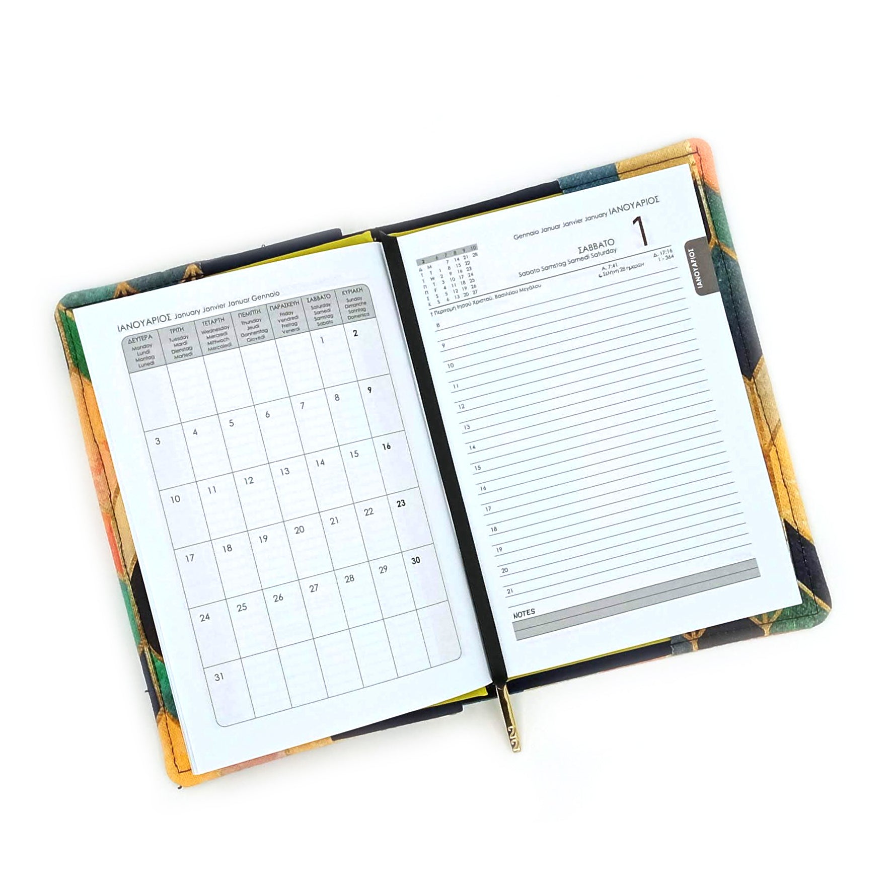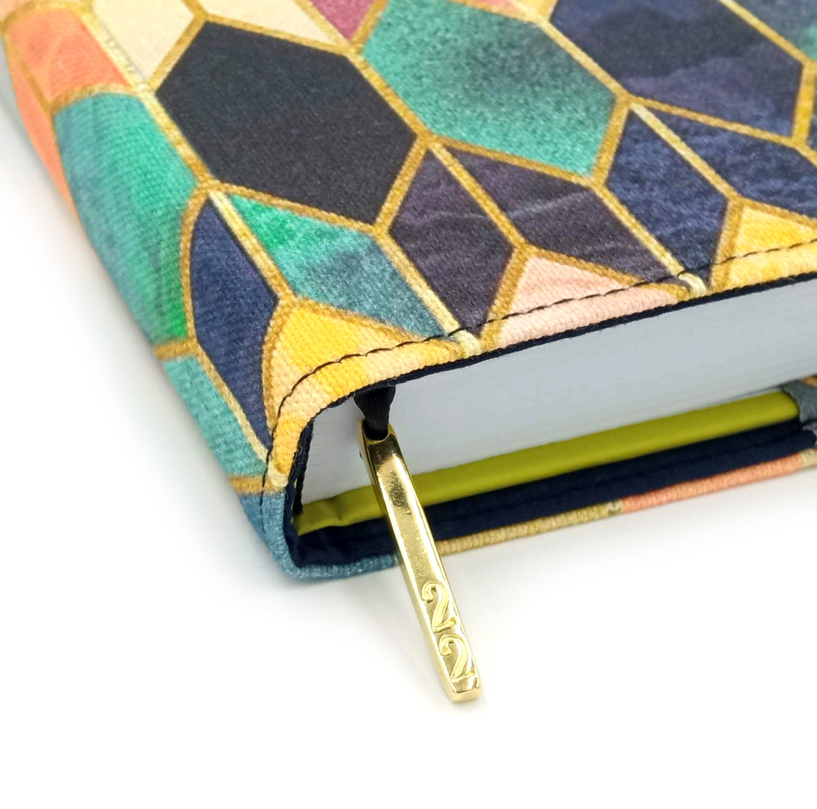 Συνδυάζει ύφασμα με γεωμετρικό σχέδιο εξωτερικά με μονόχρωμο εσωτερικά και έχει ενσωματωμένο σελιδοδείκτη με μεταλλική λεπτομέρεια '22'
