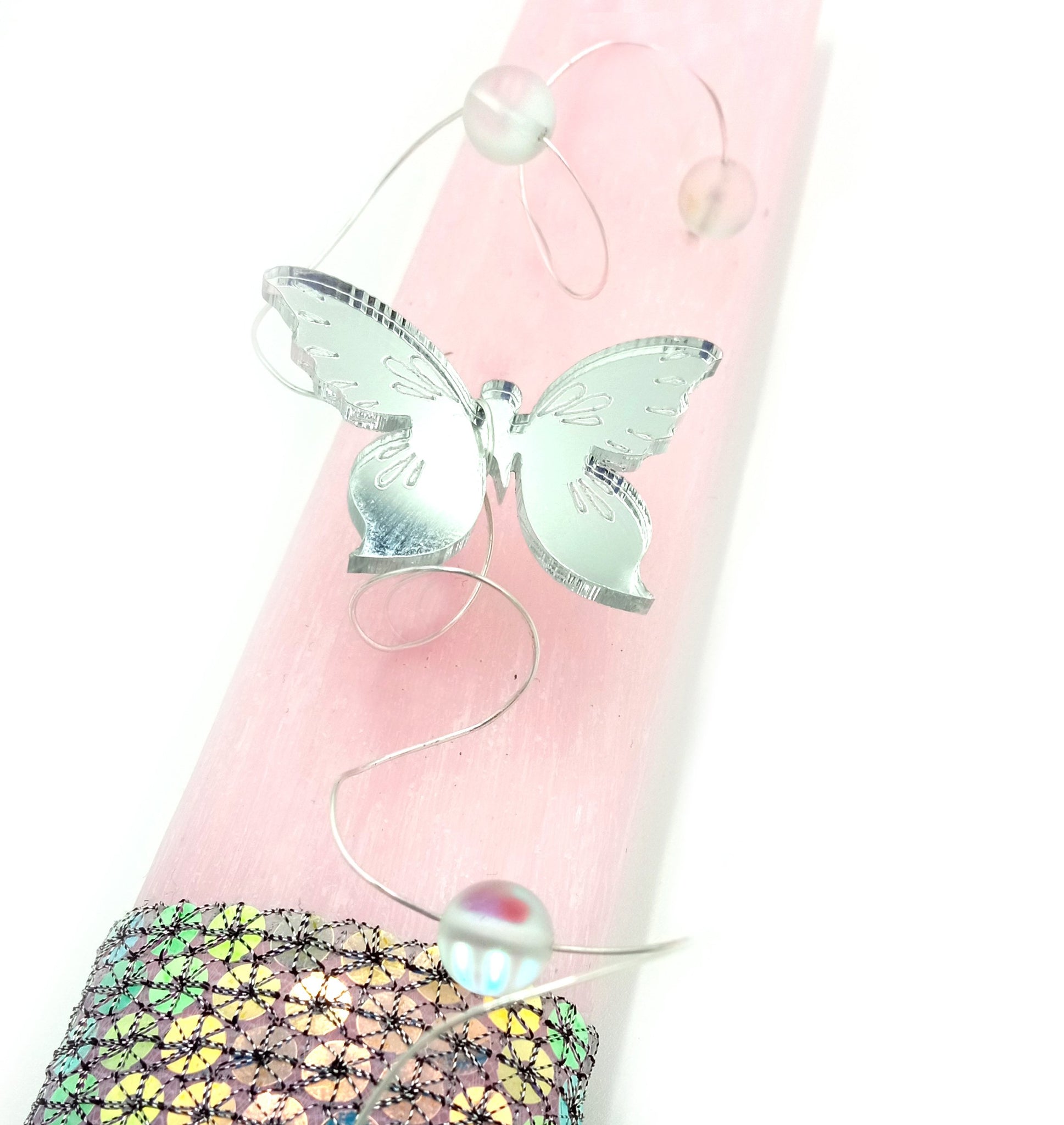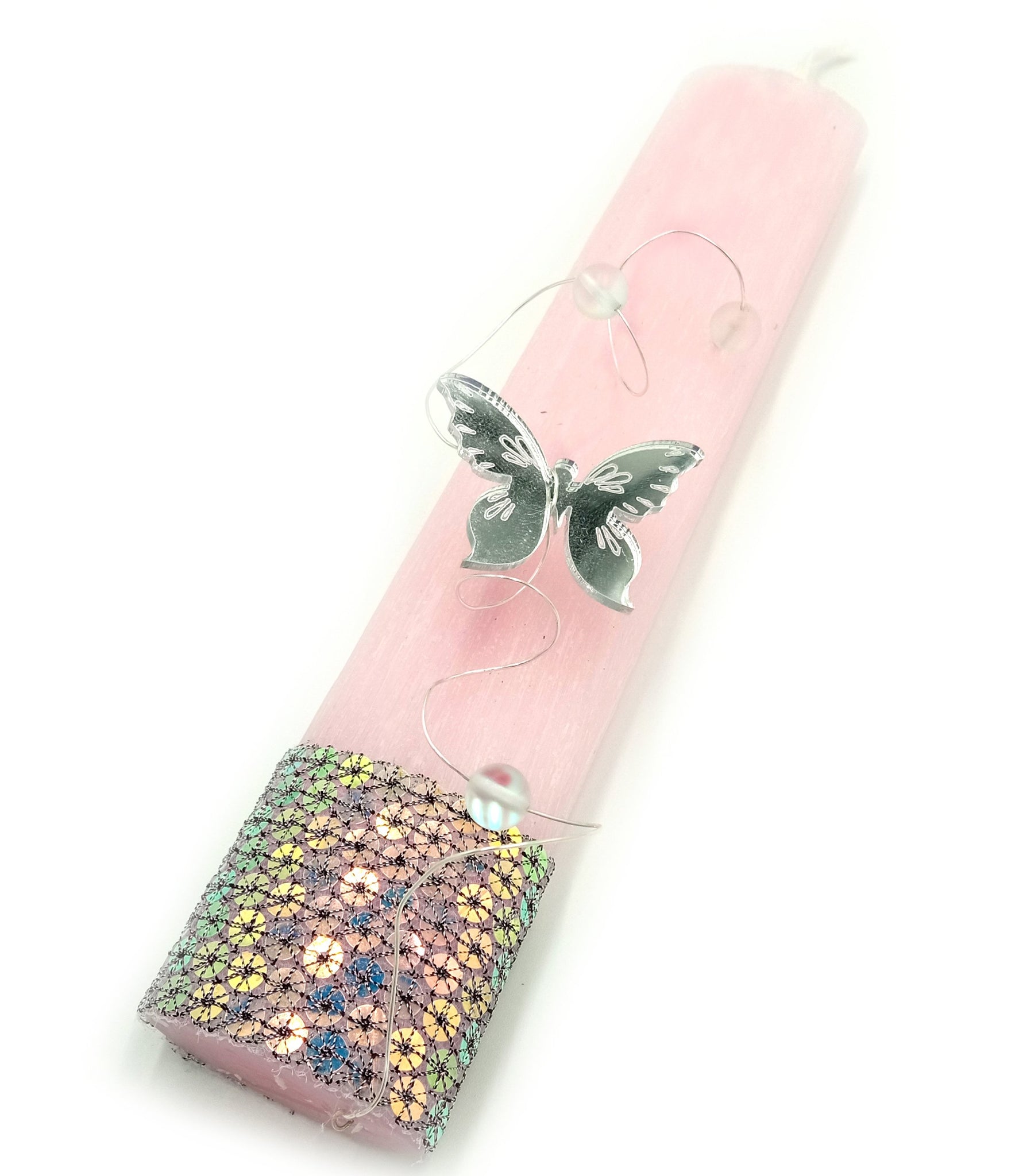Πασχαλινή χειροποίητη λαμπάδα με ροζ οβάλ αρωματικό κερί ύψους 20cm, κορδέλα με παγιέτες, σύρμα, χάντρες και διακοσμητικό στοιχείο από plexi glass.