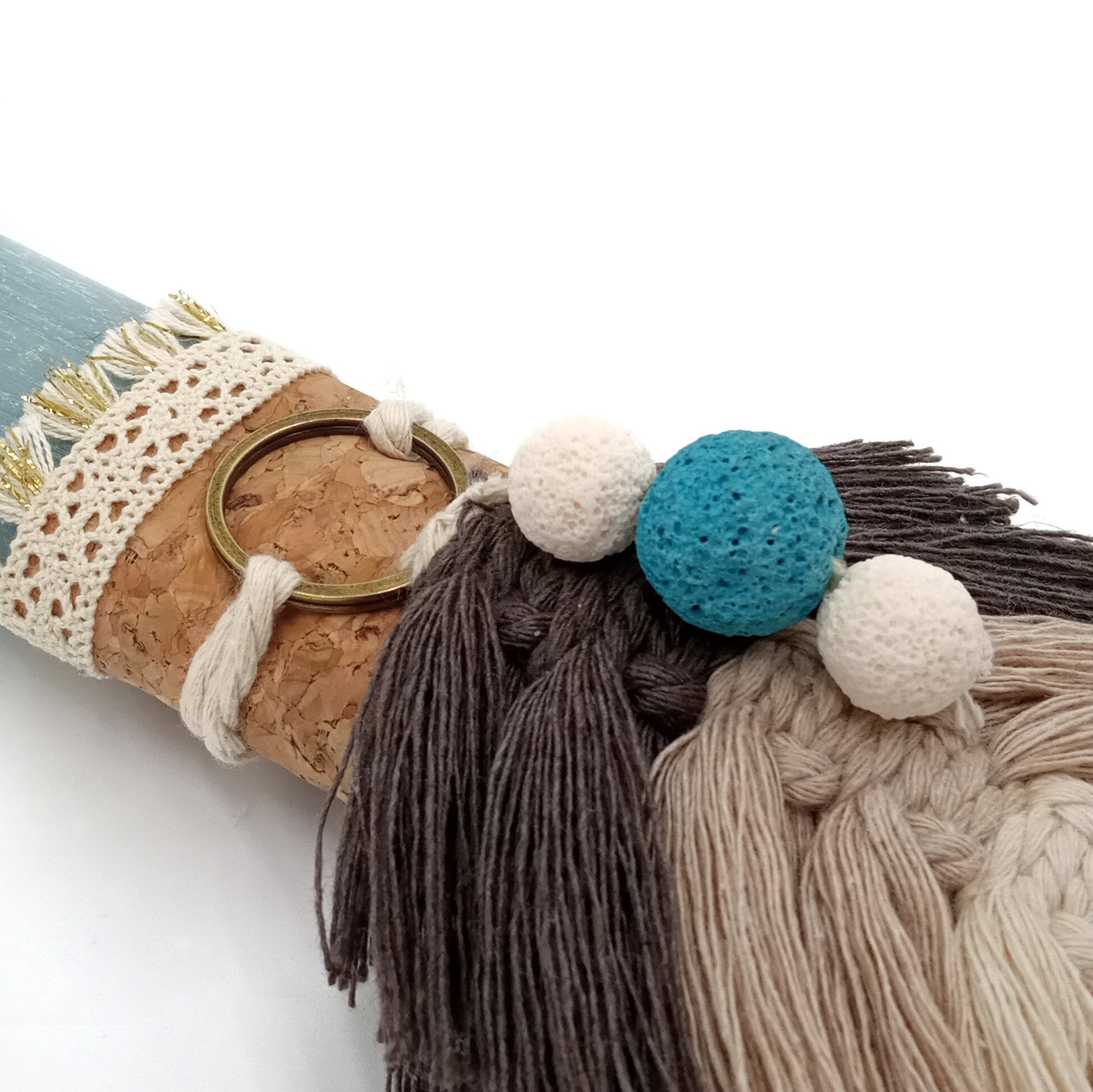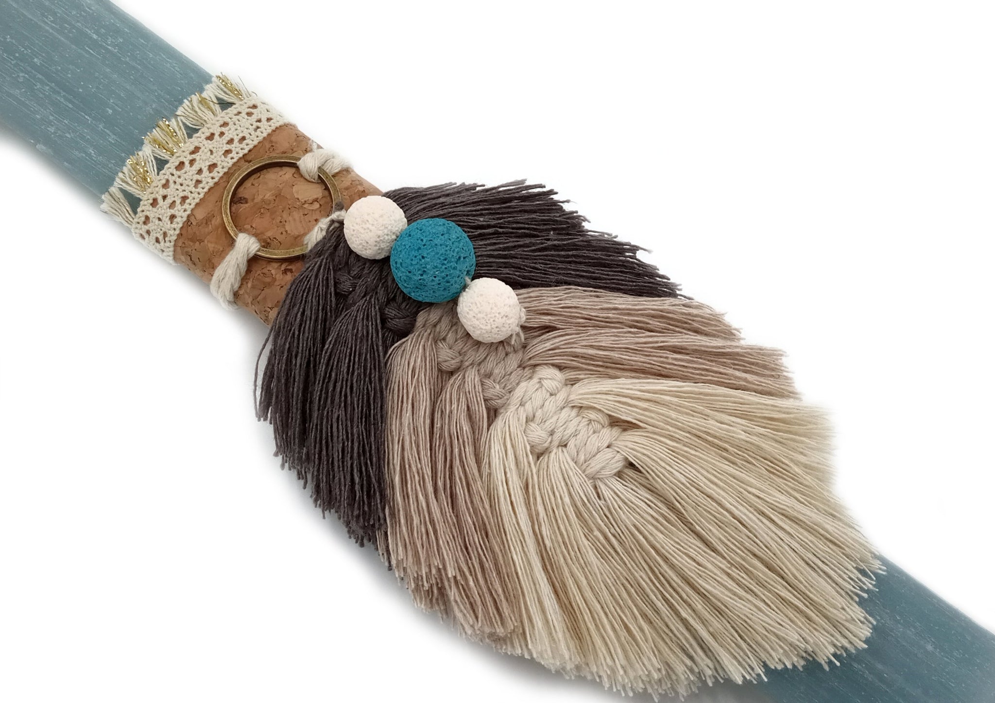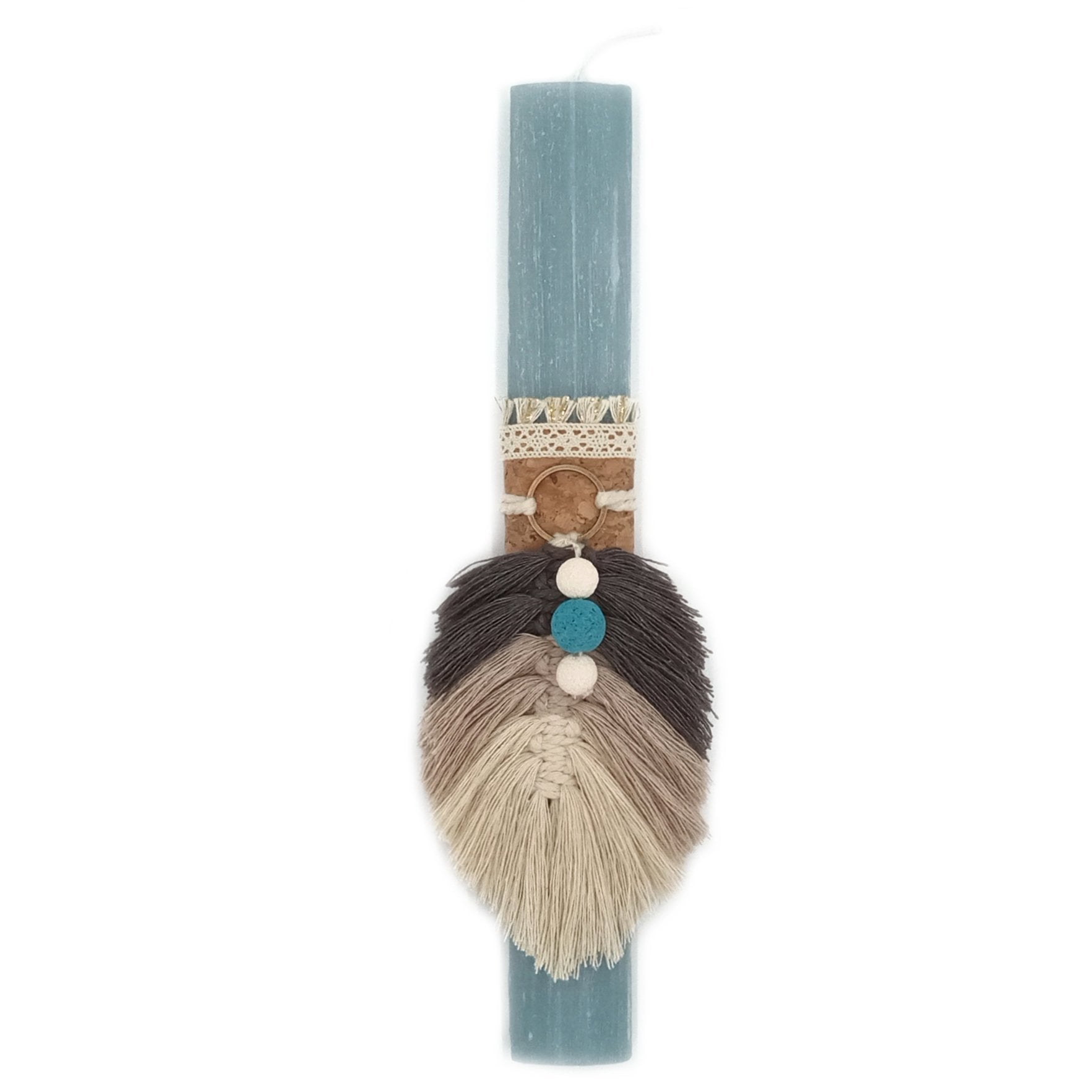 Πασχαλινή λαμπάδα με οβάλ αρωματικό κερί ύψους 30cm, χειροποίητο διακοσμητικό στοιχείο φύλλο μακραμέ σε γήινα χρώματα και πέτρες λάβα.