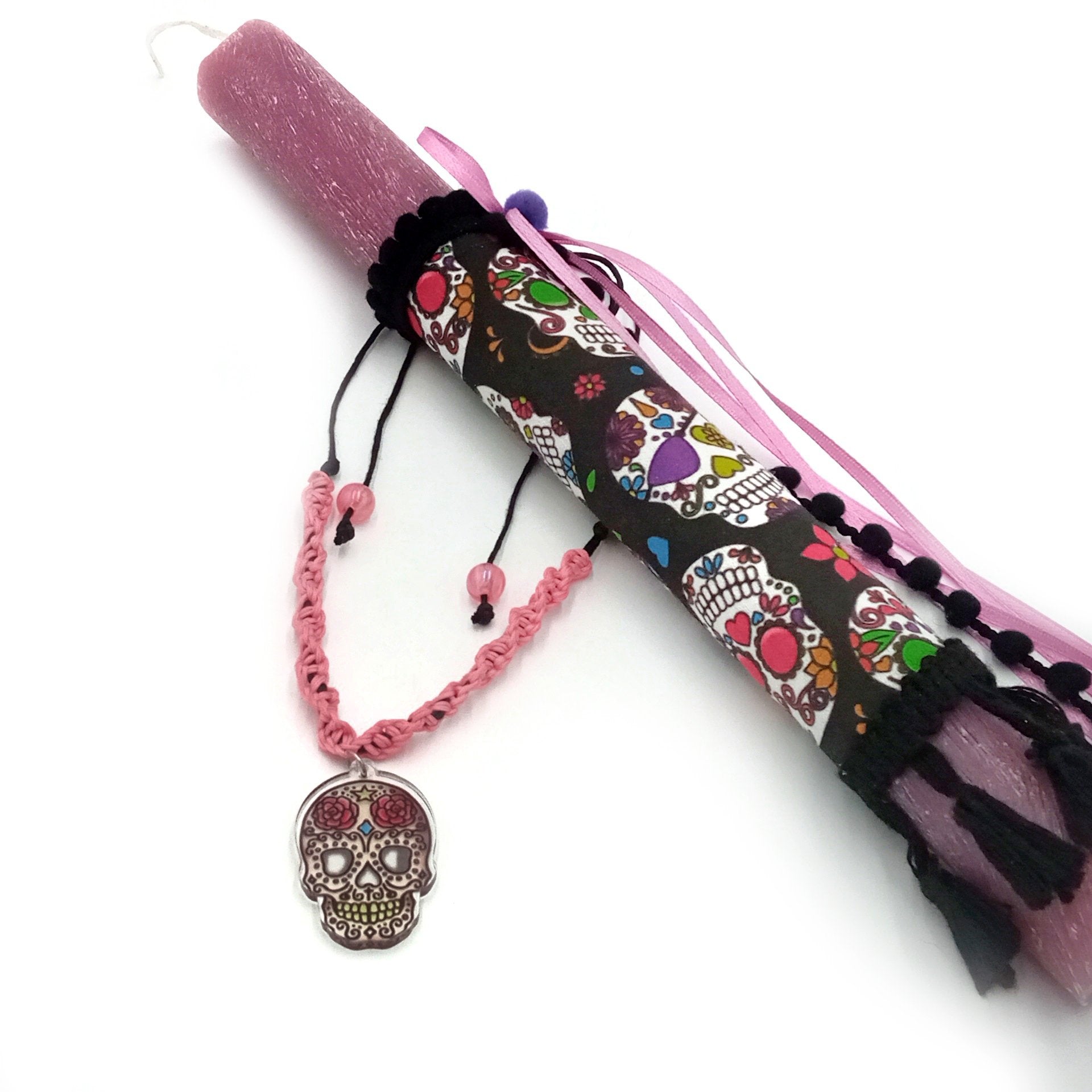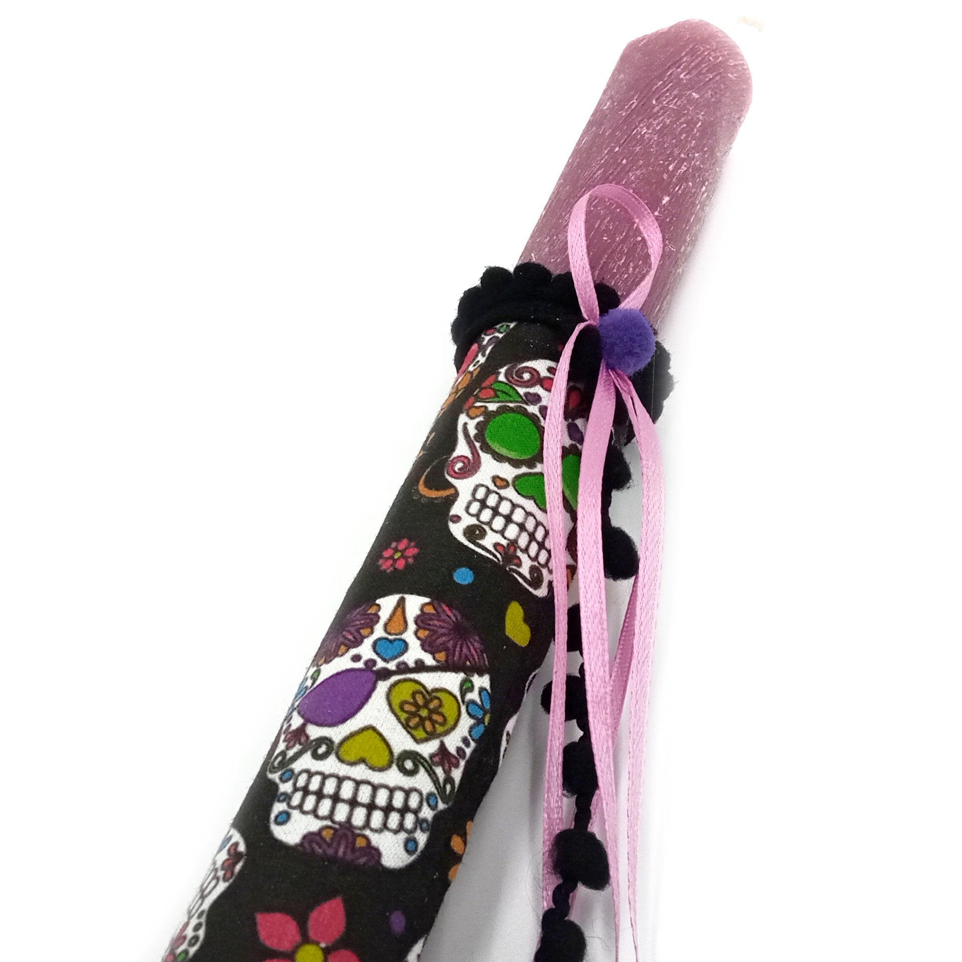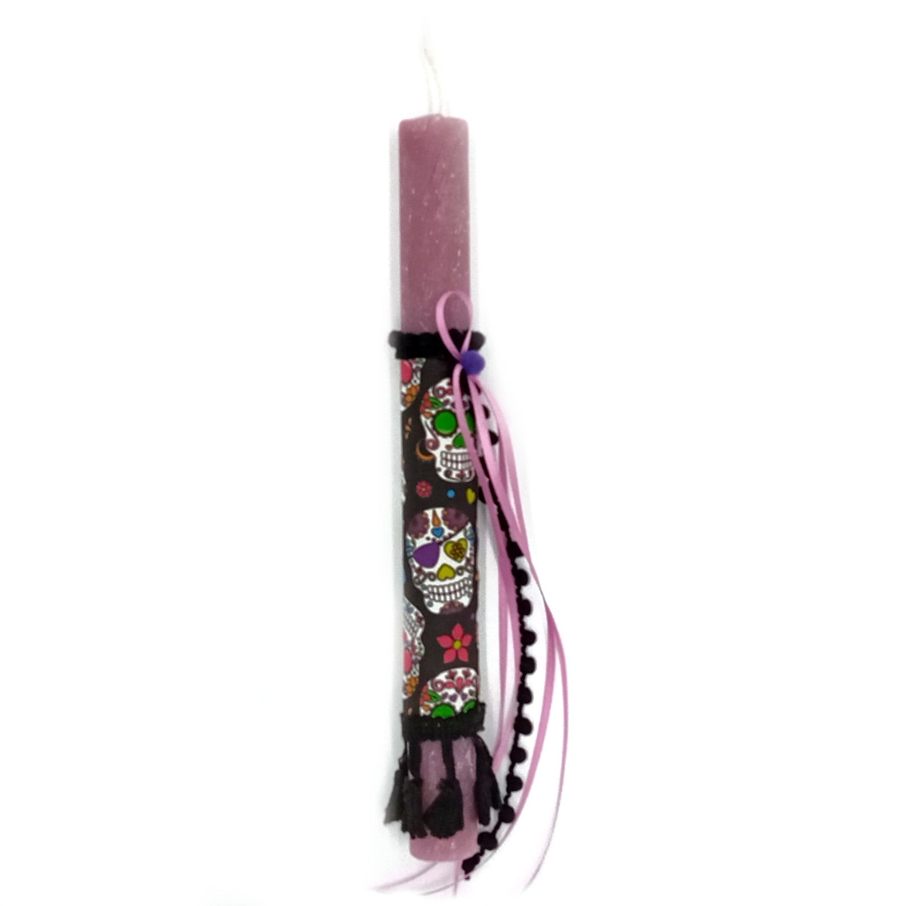 Πασχαλινή χειροποίητη λαμπάδα με στρογγυλό αρωματικό κερί ύψους 30cm και ύφασμα με σχέδιο.