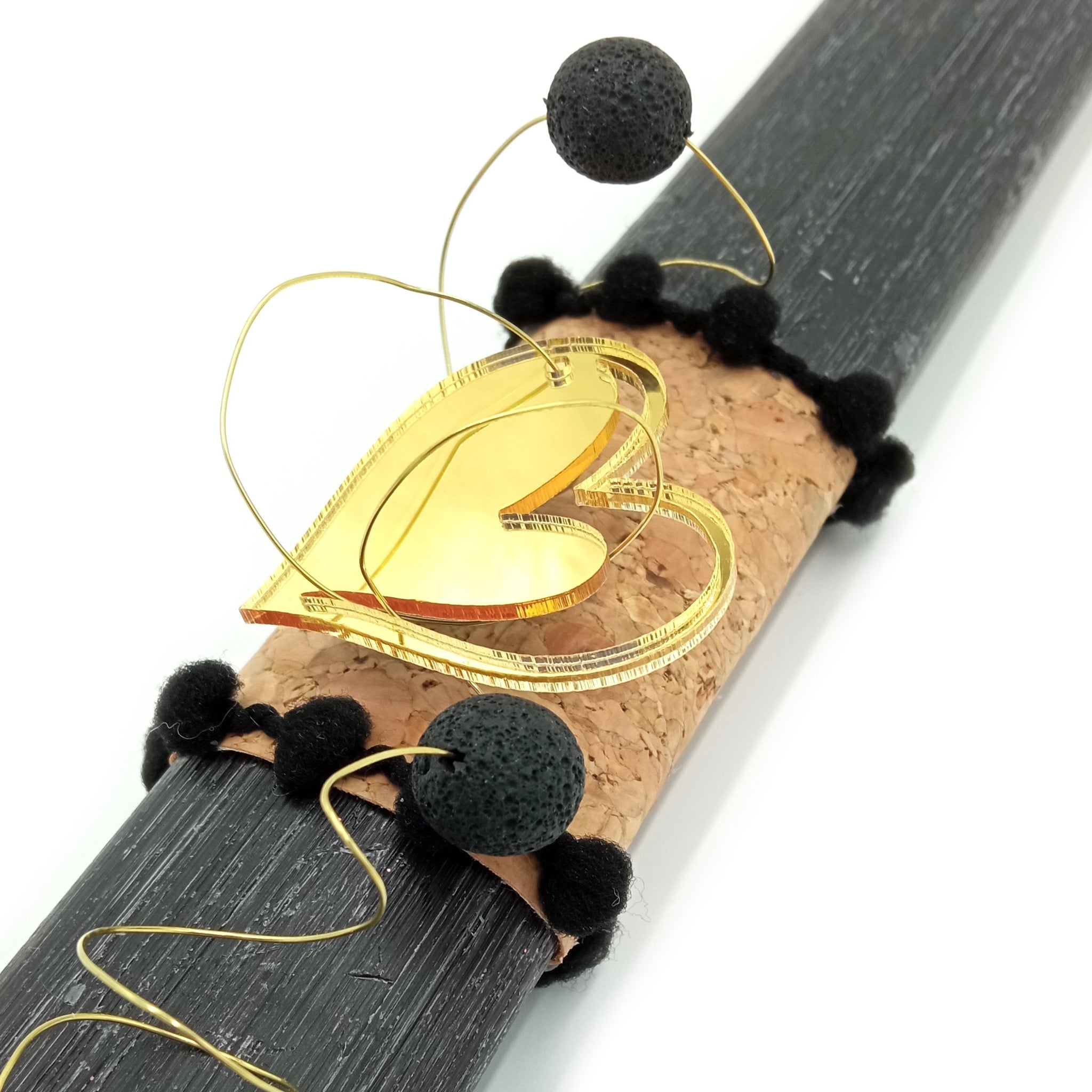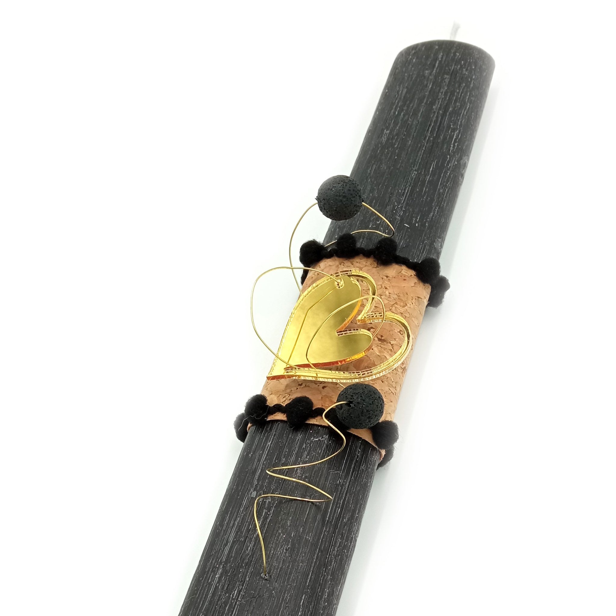 Πασχαλινή χειροποίητη λαμπάδα με μαύρο οβάλ αρωματικό κερί ύψους 30cm, φελό, σύρμα, χάντρες λάβα και χρυσό διακοσμητικό στοιχείο από plexi glass.