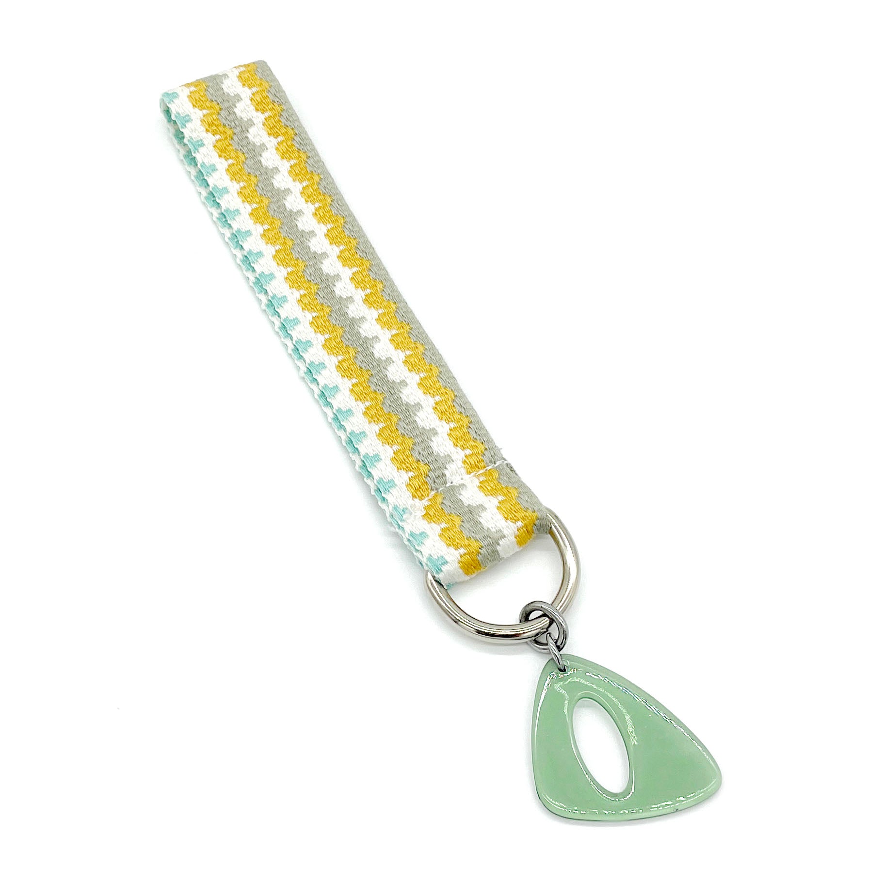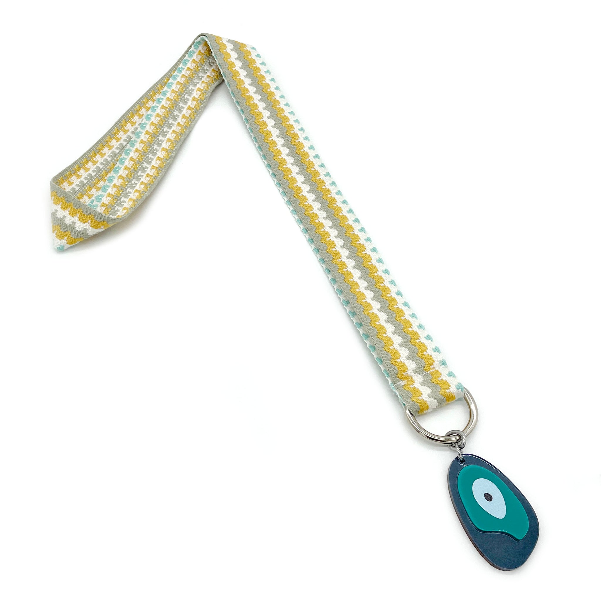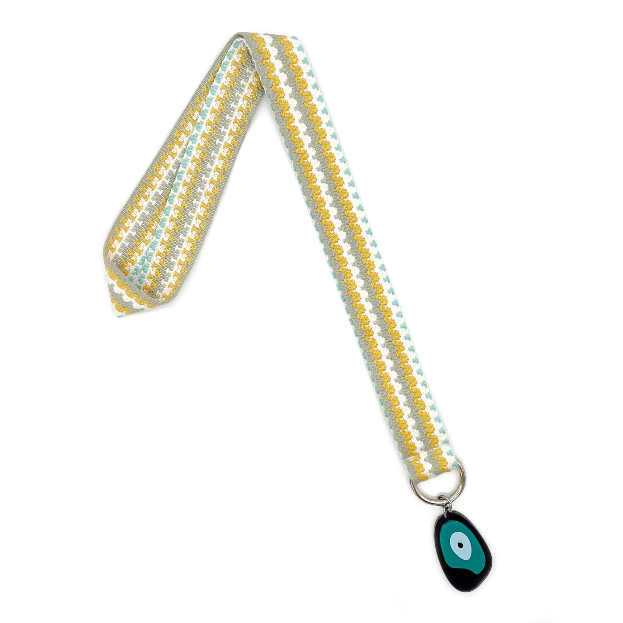 Χειροποίητο μπρελόκ από υφαντό ιμάντα φάρδους 3cm, μεταλλικό κρίκο και plexi glass διακοσμητικό στοιχείο.