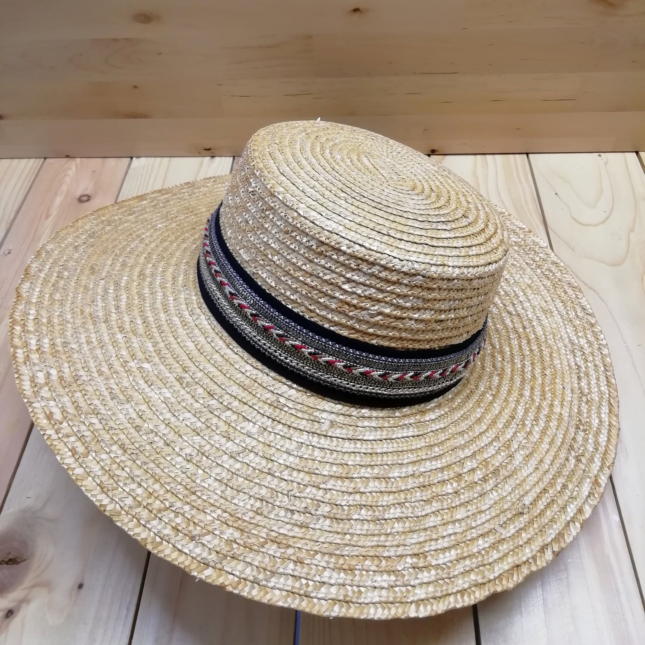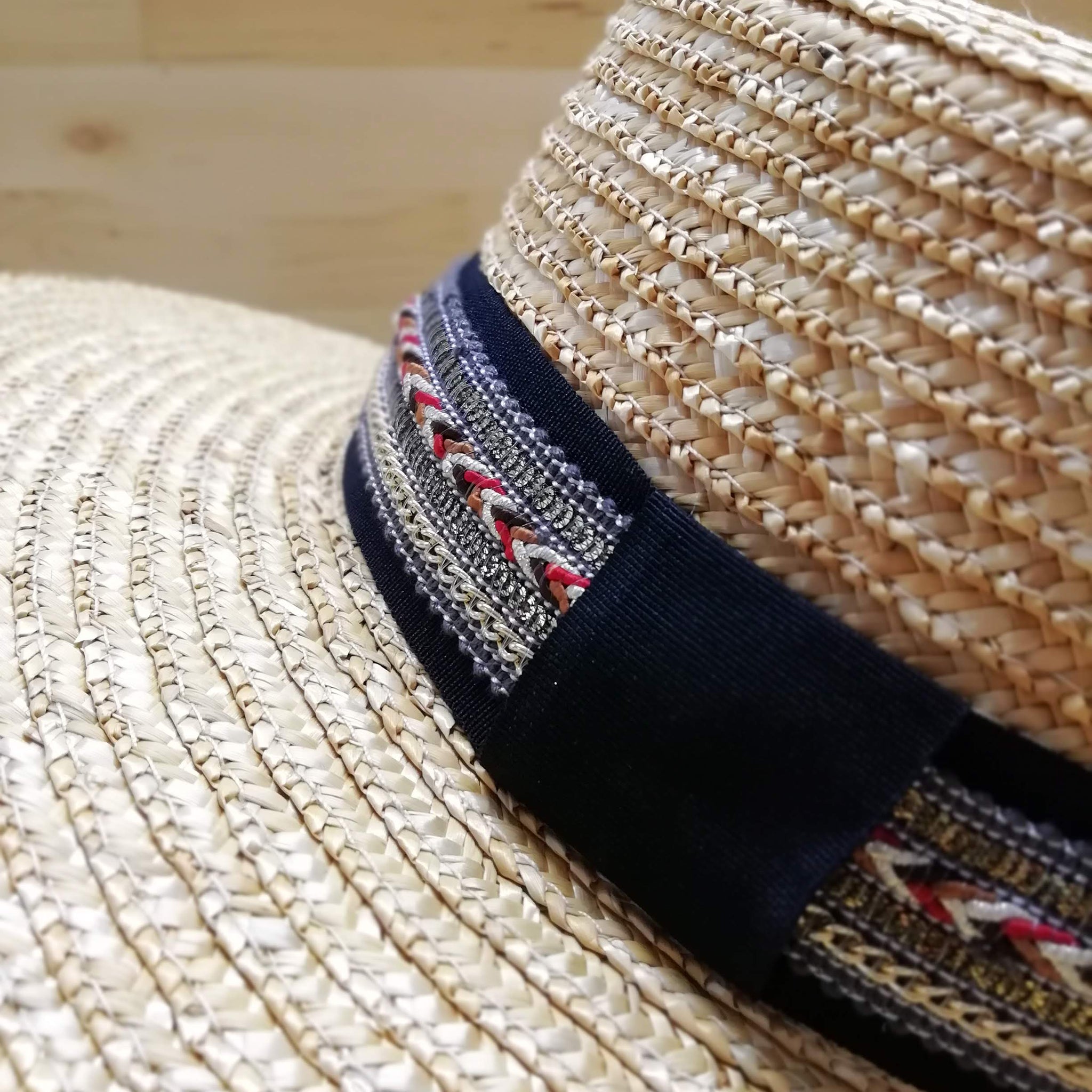 Ψάθινο καπέλο στυλ boater σε φυσικό χρώμα με υφασμάτινη κεντητή διακοσμητική τρέσα.