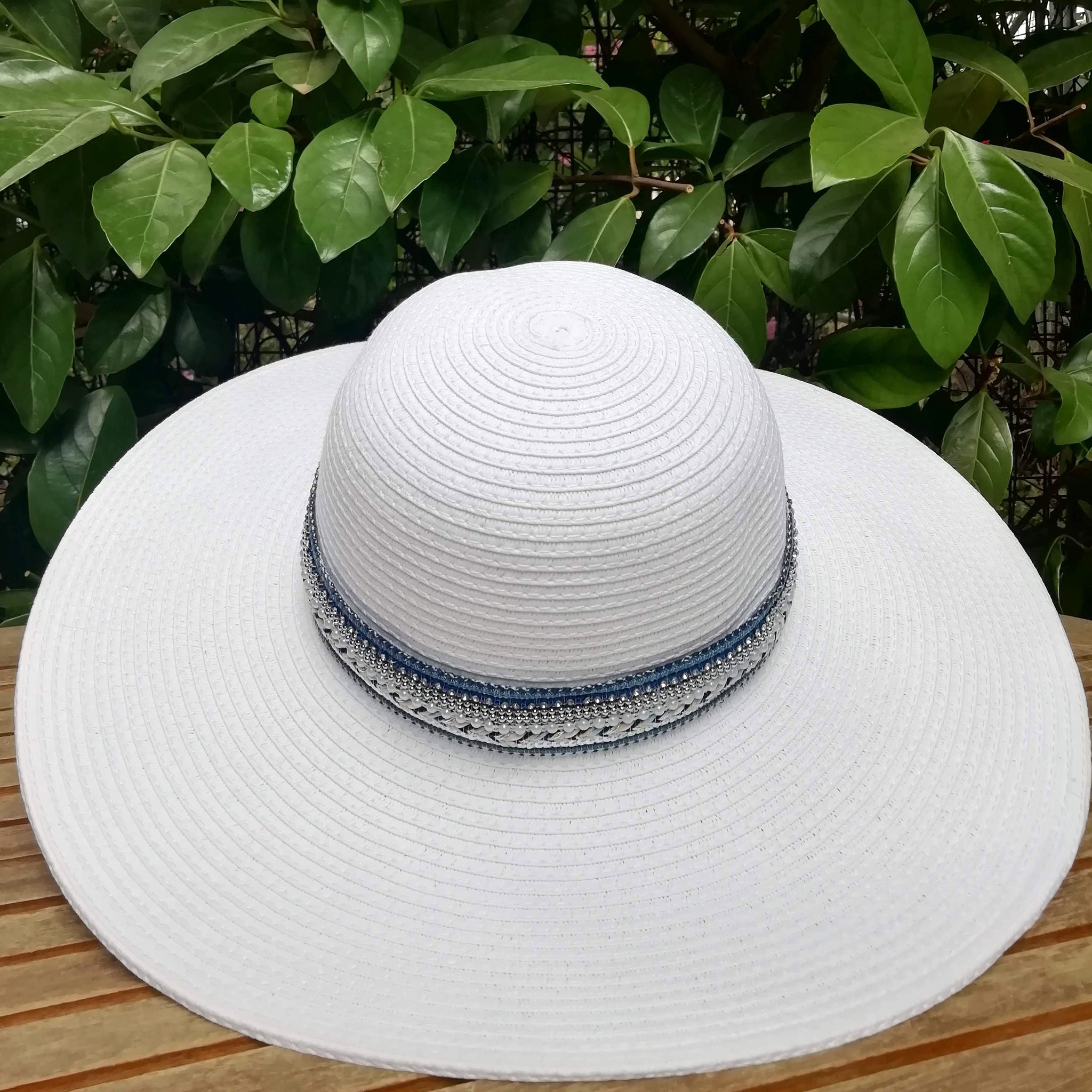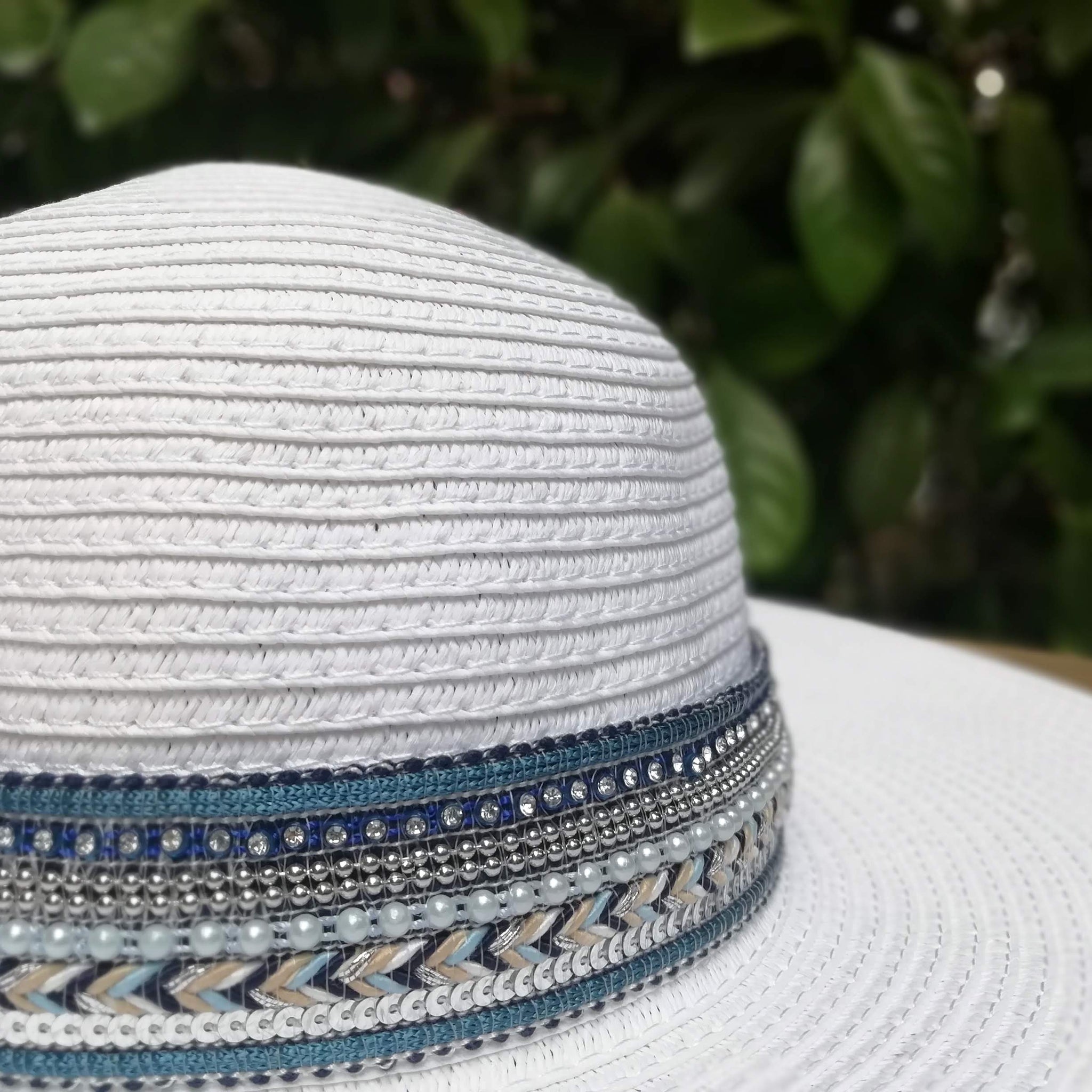 Λευκό γυναικείο καπέλο διακοσμημένο με υφασμάτινη τρέσα με πέρλες και στρας.